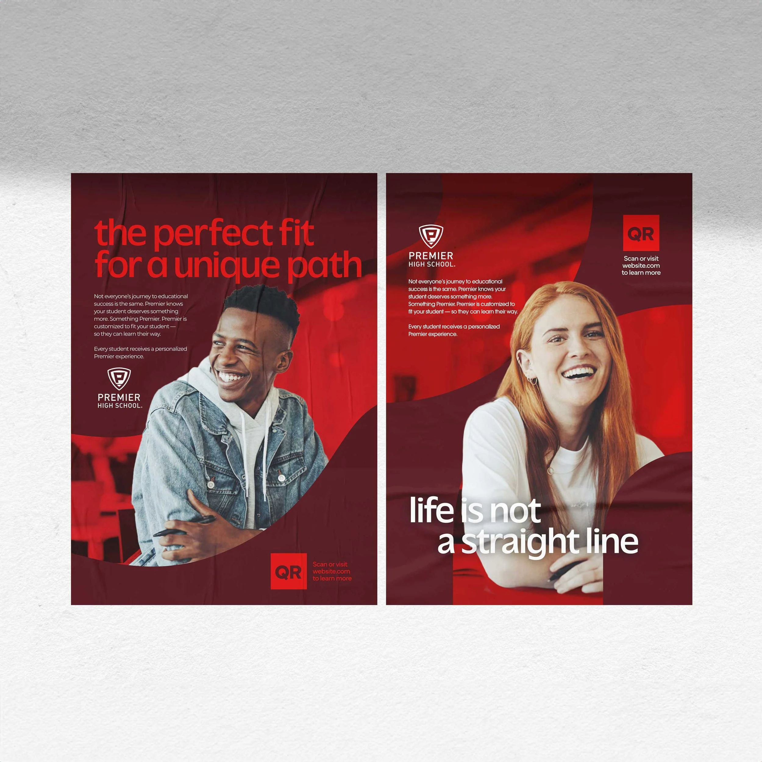 The creative direction of this campaign is reflective of this unique path tailored for every student. Each piece of creative features a through-line acting as a visual reference to the paths. The students are “cut out” and breaking the boarder of the path they are placed on, showing that education is not a cookie-cutter process, and highlighting the individualism of the student in the ads. The colors used are an evolution on the existing Premier color palette. For typography, I chose a typeface that featured unique curved letterforms to mimic the pathways featured throughout.